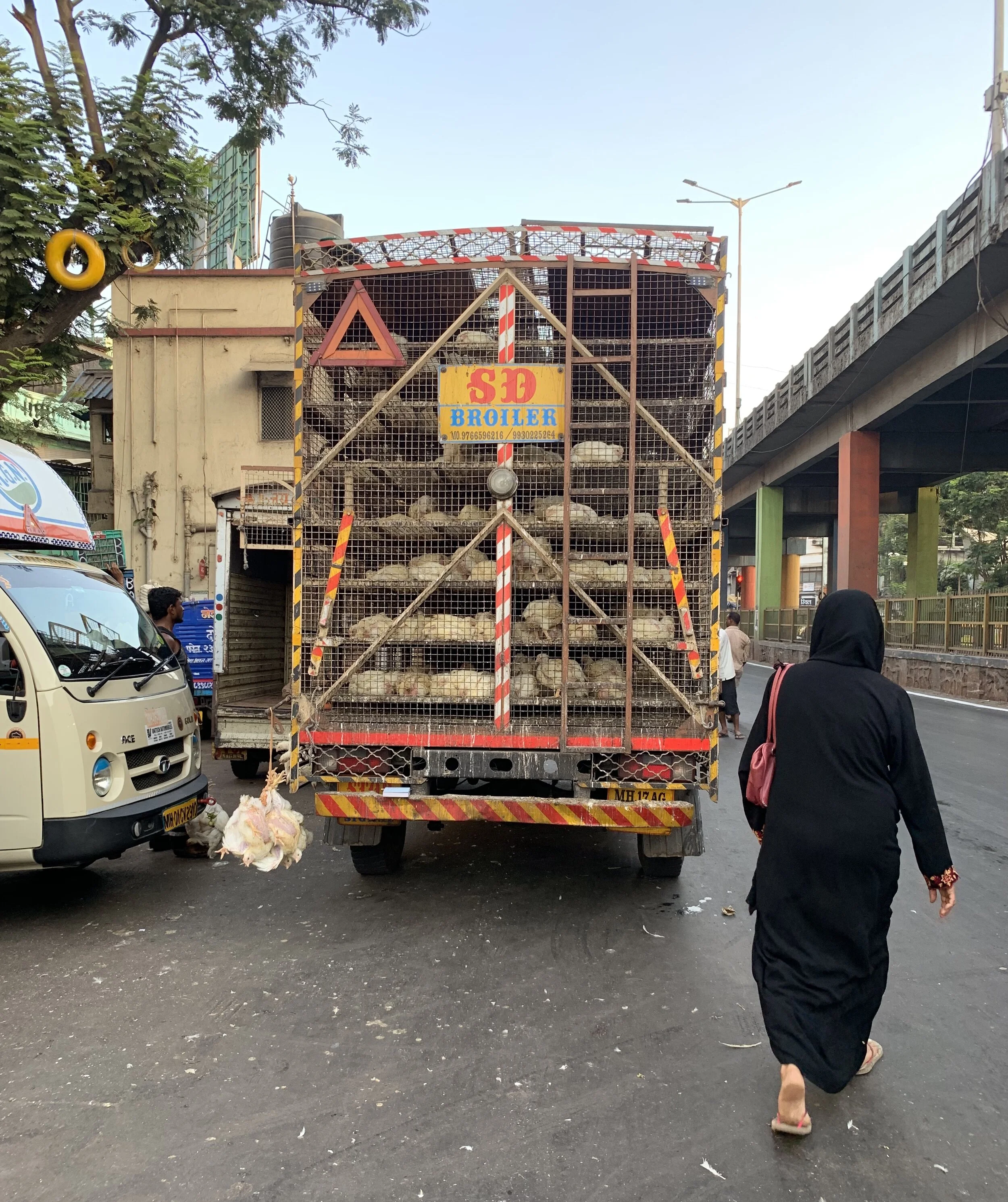 Our final day was packed. We began early with a ‘Mumbai by Dawn’ tour. It was brilliant. As we were walking away from our final stop, we came upon a small truck packed with birds. The chickens were waiting outside a low slung, nondescript building. It hit me that they were living the final few minutes of their lives, waiting to enter the structure to die.